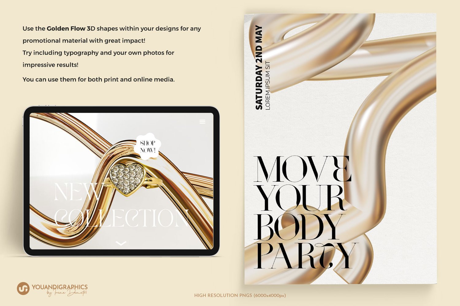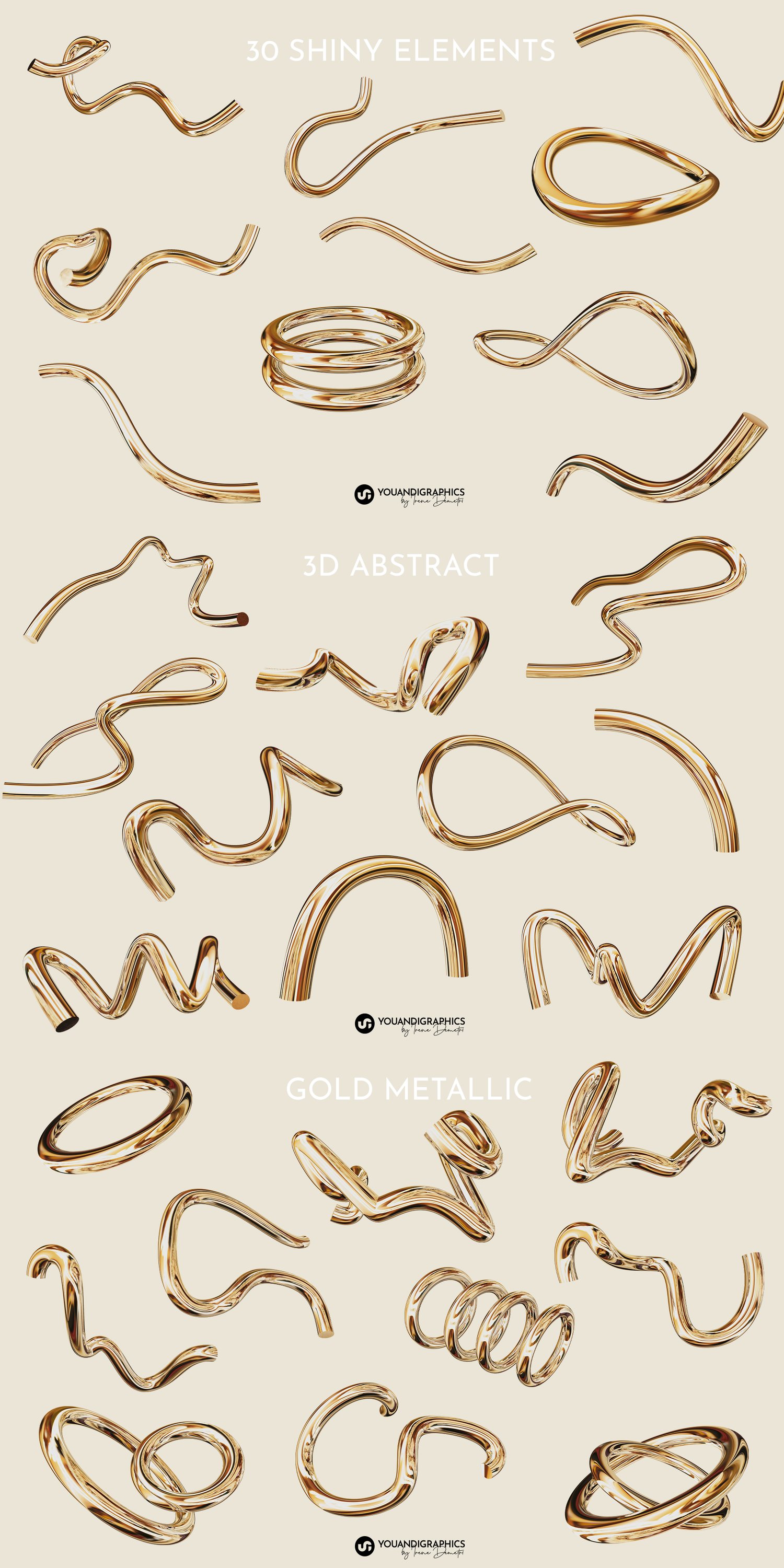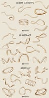 A collection of 60 3D Abstract Gold Elements available as high resolution PNG files with transparent backgrounds in both shiny and mat finishing.